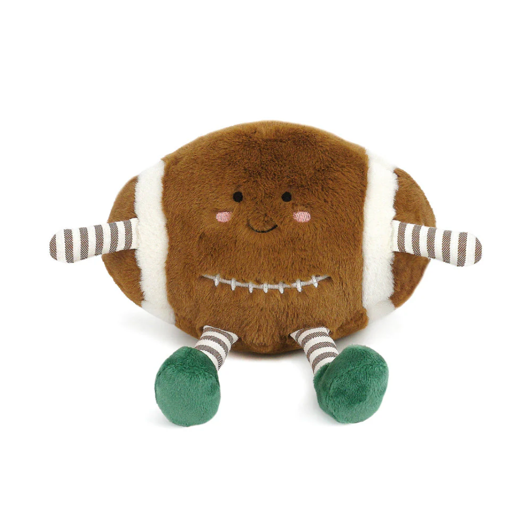 Meet Freddie Football, the cuddliest MVP of the game! With his super soft, textured brown fur and signature white stitching, Freddie puts a snuggly spin on classic football fun. His cheerful embroidered face, complete with rosy cheeks, brings playful charm, while his striped arms and legs, topped with green plush sneakers, have him ready to score big in both playtime and snuggle time. Whether he's the star of an imaginary touchdown or a cozy cuddle buddy, Freddie Football is the perfect teammate for any little athlete's plush collection.
